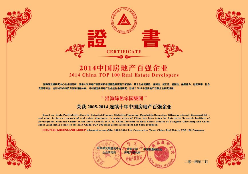 2014年3月27日上午,北京釣魚臺國賓館嘉朋滿座,由國務院發展研究中心企業研究所、清華大學房地產研究所和中國指數研究院三家單位共同主辦的房地產盛會——“2014年中國房地產百強企業研究成果發布會”在此隆重舉行,沿海綠色家園集團不負眾望,連續十年獲頒“中國房地產百強企業稱號”殊榮。