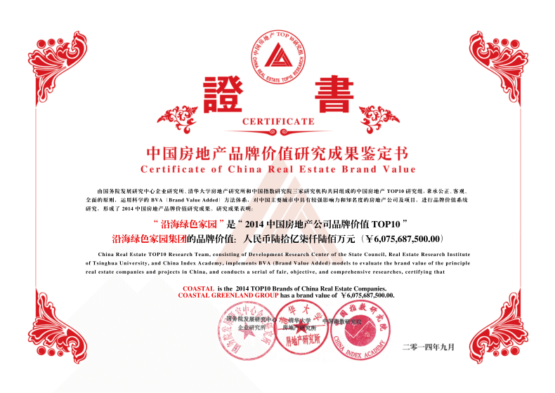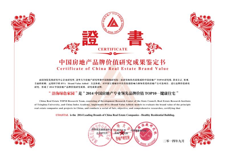 9月19日由國(guó)務(wù)院發(fā)展研究中心企業(yè)研究所、清華大學(xué)房地產(chǎn)研究所、中國(guó)指數(shù)研究院主辦、中國(guó)房地產(chǎn)TOP10研究組承辦的“2014中國(guó)房地產(chǎn)品牌價(jià)值研究成果發(fā)布會(huì)暨第十一屆中國(guó)房地產(chǎn)品牌發(fā)展高峰論壇”上,沿海綠色家園集團(tuán)連續(xù)十一年榮膺“2014年中國(guó)房地產(chǎn)品牌價(jià)值TOP10”(混合所有)獎(jiǎng)項(xiàng),品牌價(jià)值更是升至60.76億。同時(shí)還榮獲“2014年中國(guó)房地產(chǎn)專業(yè)領(lǐng)先品牌價(jià)值top10-——健康住宅”獎(jiǎng)項(xiàng)。